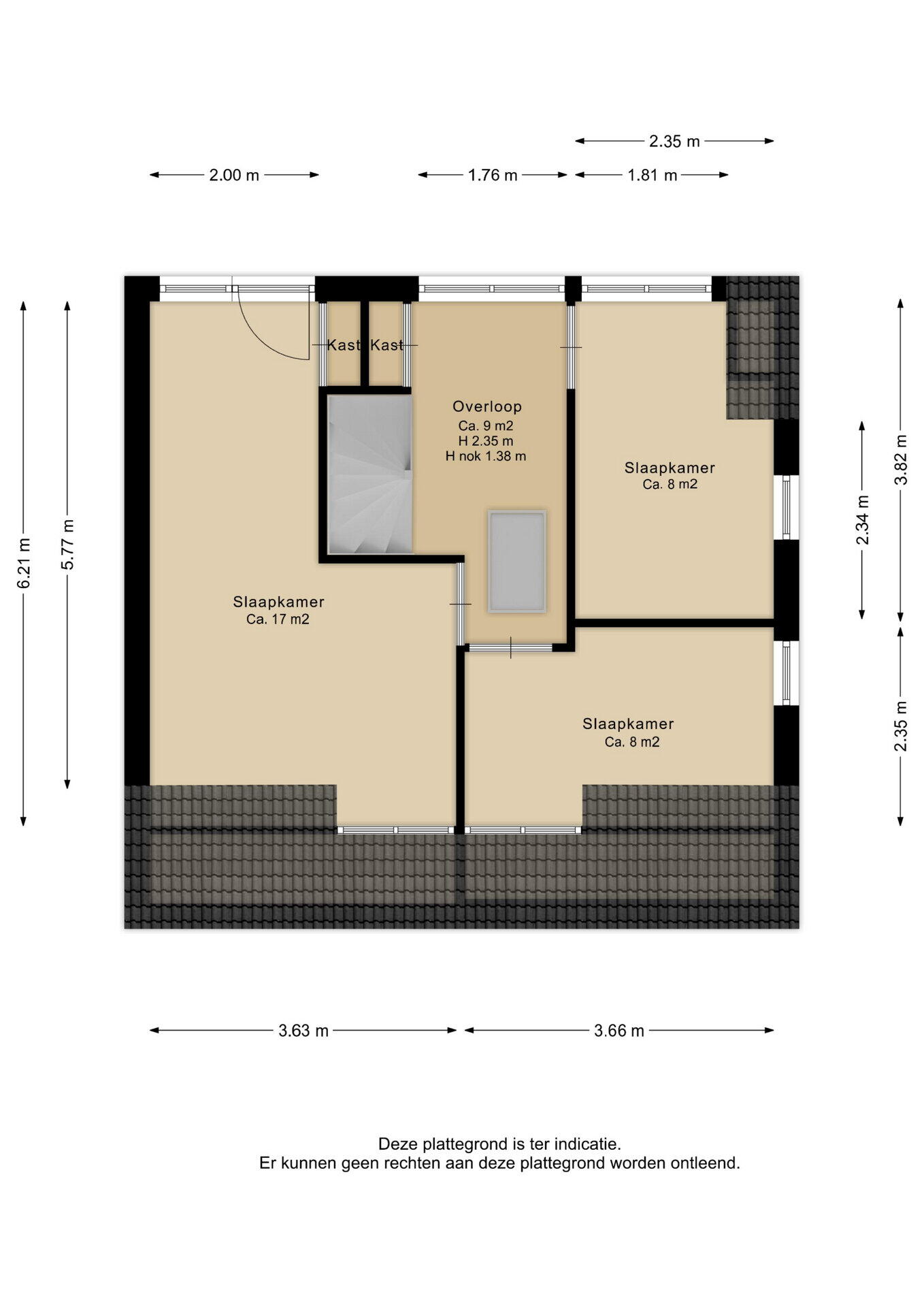 Overloop met vaste kast en drie slaapkamers (ca. 8 m2, 8 m2 en 17 m2). De grootste slaapkamer is voorzien van vaste kast.